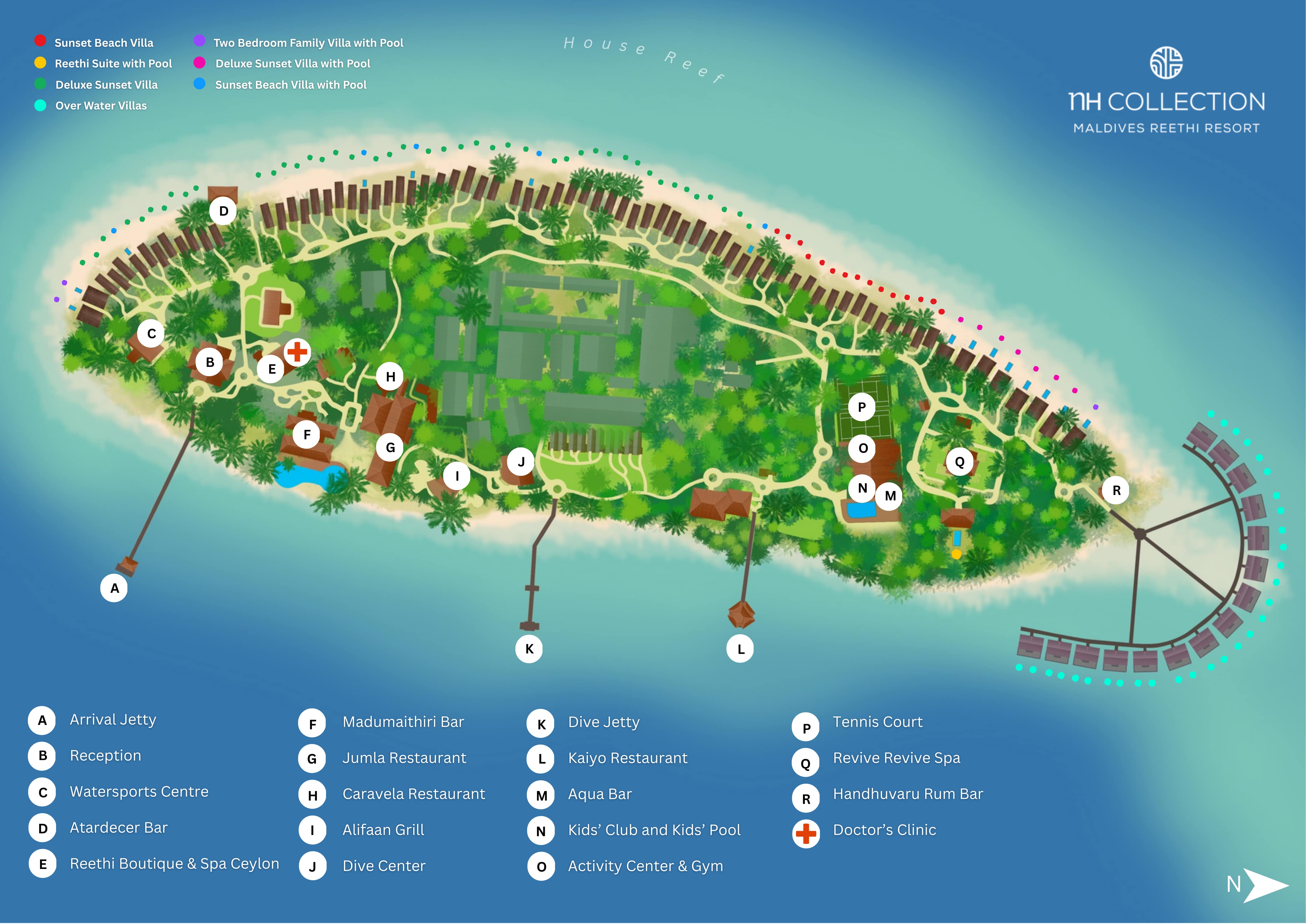 Le ville del NH Collection Maldives Reethi Resort sono progettate in armonia con l’ambiente naturale: tetti in stile maldiviano, arredi contemporanei e spazi ampi che valorizzano la luce e la privacy.